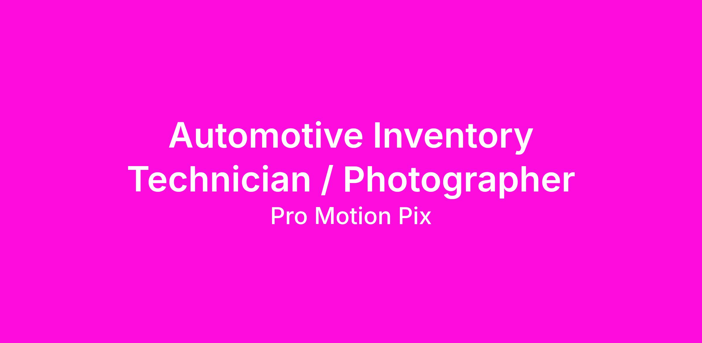Pro-MotionPix is hiring a full-time Automotive Inventory Technician / Photographer to support dealership operations by managing and photographing vehicle inventory for online listings.
