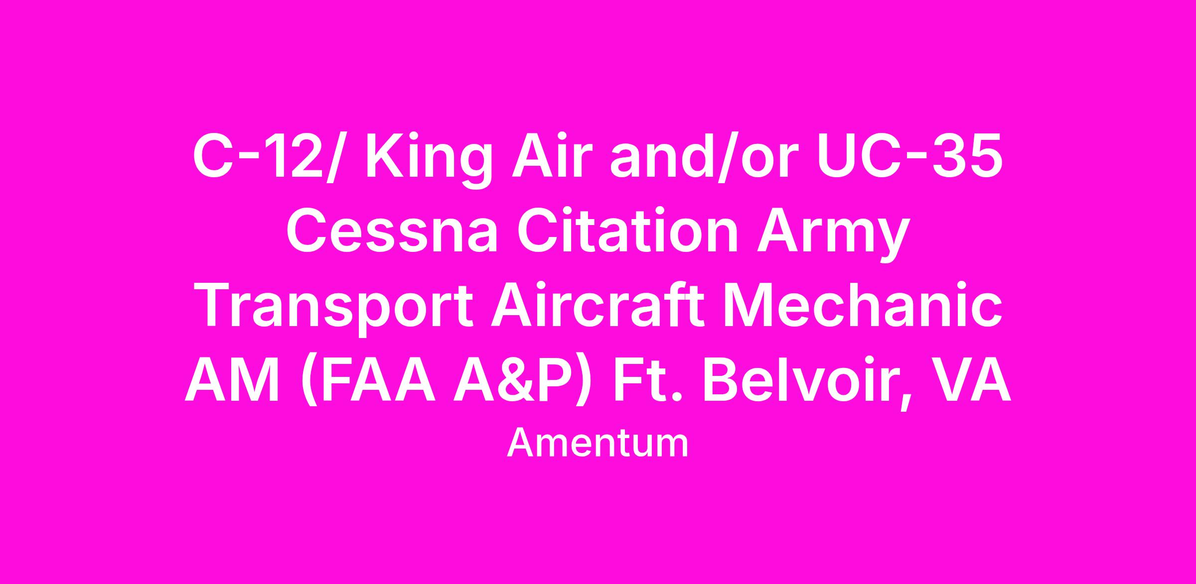 The C-12/ King Air and/or UC-35 Cessna Citation Army Transport Aircraft Mechanic AM-1 (FAA A&P). Performs organizational and intermediate level maintenance on C-12/ King Air 200/350/1900 and/or UC-35 Cessna Citation aircraft.