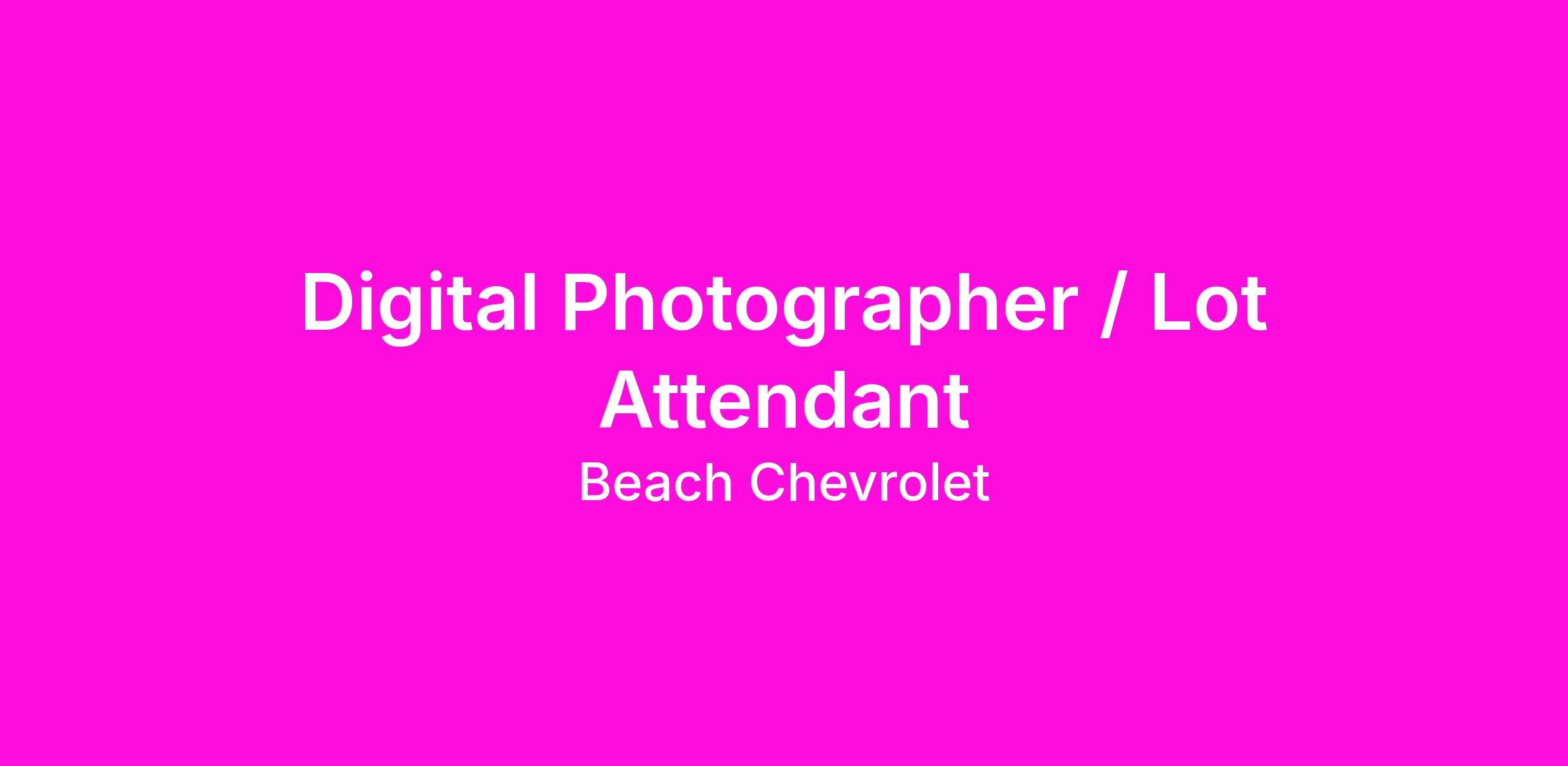 Beach Chevrolet is in search of an individual to take photos of our constant changing vehicle inventory. This person will also need to be sure our vehicle lot is well maintained and in neat, professional order. This includes making sure our vehicles have window stickers, vehicles are parked in proper locations, and a constant inventory count to ensure each vehicle is in its proper space and accounted for.