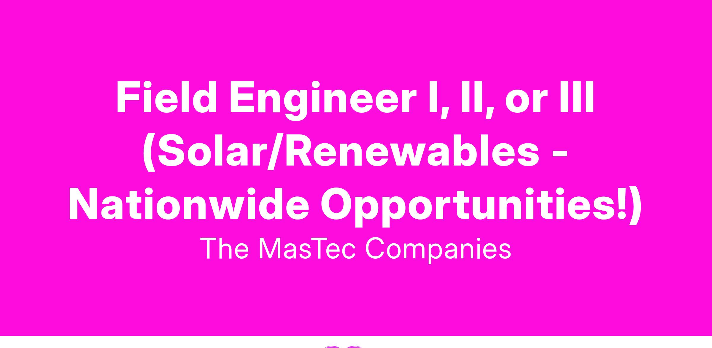 Location & Travel Details: You’ll get the opportunity to travel across the US, helping our team build renewable projects. This is a traveling position, up to 100% of the time. You have the potential to be placed on a project site located in any state throughout the US. You’ll spend 8-12 months on average per project. We offer designated daily per diem in addition to base pay to support and help you cover living expenses. This position is eligible for routine travel home (rotation) from the jobsite. This role is eligible for a monthly vehicle allowance.
