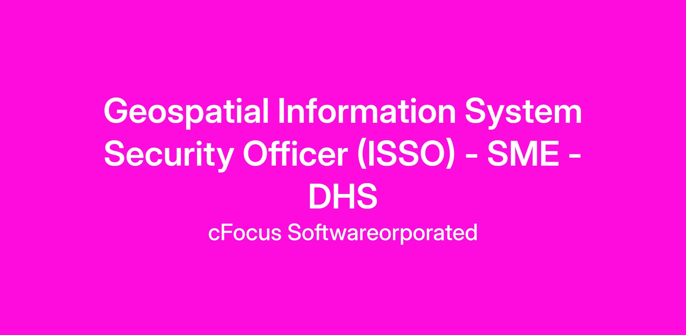 cFocus Software seeks a Geospatial Information System Security Officer (ISSO)SME to join our program supporting the Department of Homeland Security (DHS). This position is on-site in Springfield, VA. This position requires a Public Trust Clearance