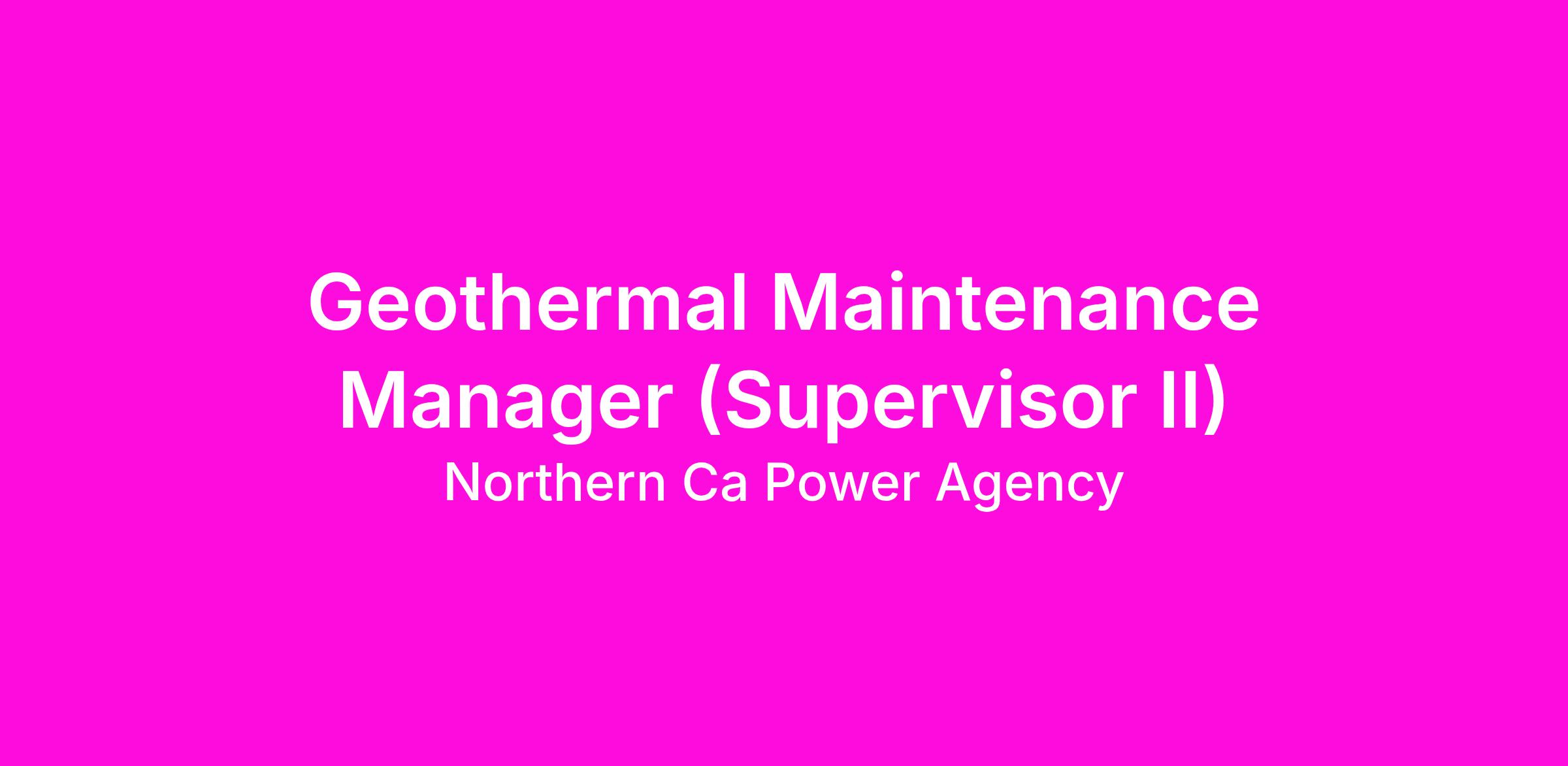 The Maintenance Manager oversees personnel, safety, environmental, and budgetary aspects of NCPA’s Geothermal (GEO) Facilities. Supervise and lead a diverse technical workforce. Roles may be split with a separate Operations Supervisor and associated plant staff. This position ensures that the GEO power plants and facilities are operated in a safe, reliable, and efficient manner.