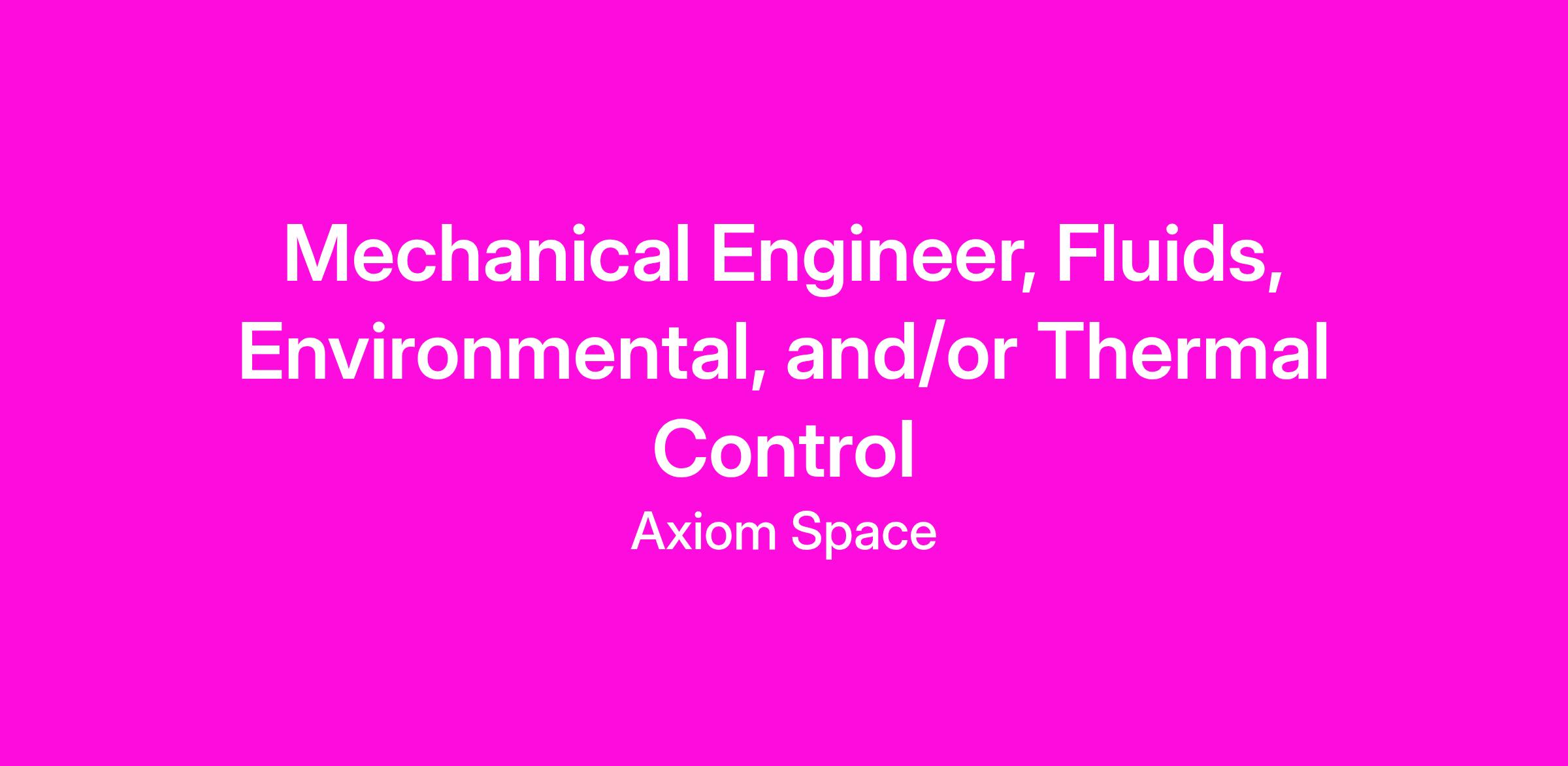 Axiom Space fosters a work environment inclusive of all perspectives. We are the pioneers of commercial space, leading the transformation of low-Earth orbit into a global space marketplace. Our mission-driven team is seeking a bold and dynamic Mechanical Engineer with Fluids, Environmental, and/or Thermal Control experience who is fueled by high ownership, execution horsepower, growth mindset, and driven to understand our world, science/technology, and life itself, for the benefit of all on Earth and beyond.