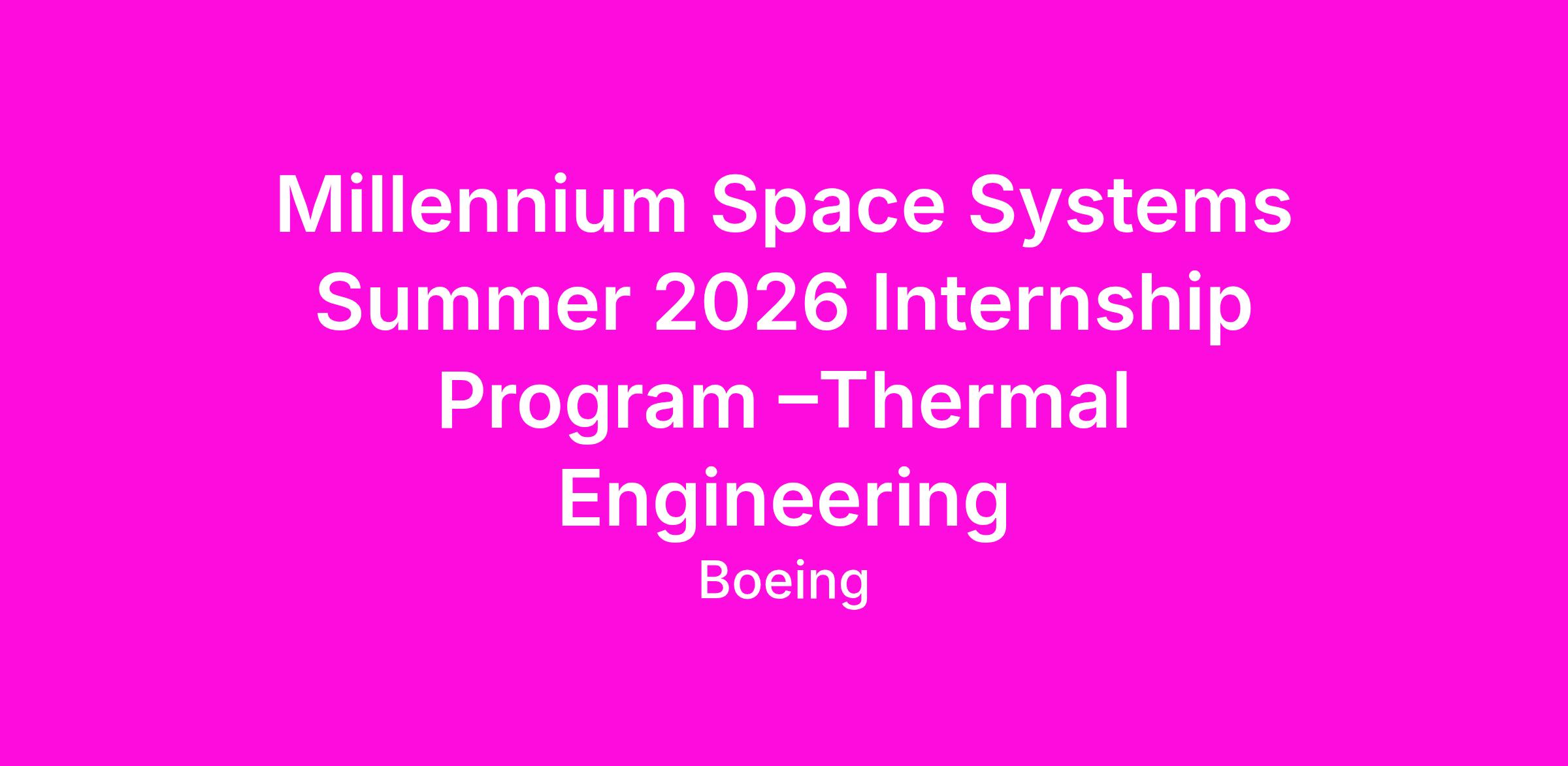 The thermal engineering intern at Millennium Space Systems will support thermal analysis and test efforts for our spacecraft and avionics. This will include using thermal analysis software to build, validate, and run thermal models, as well as oversee test planning, setup, execution, and report generation. The thermal engineering intern will support one or more of our active satellite programs, contributing to our company goal of delivering advanced satellite constellations to our customers.