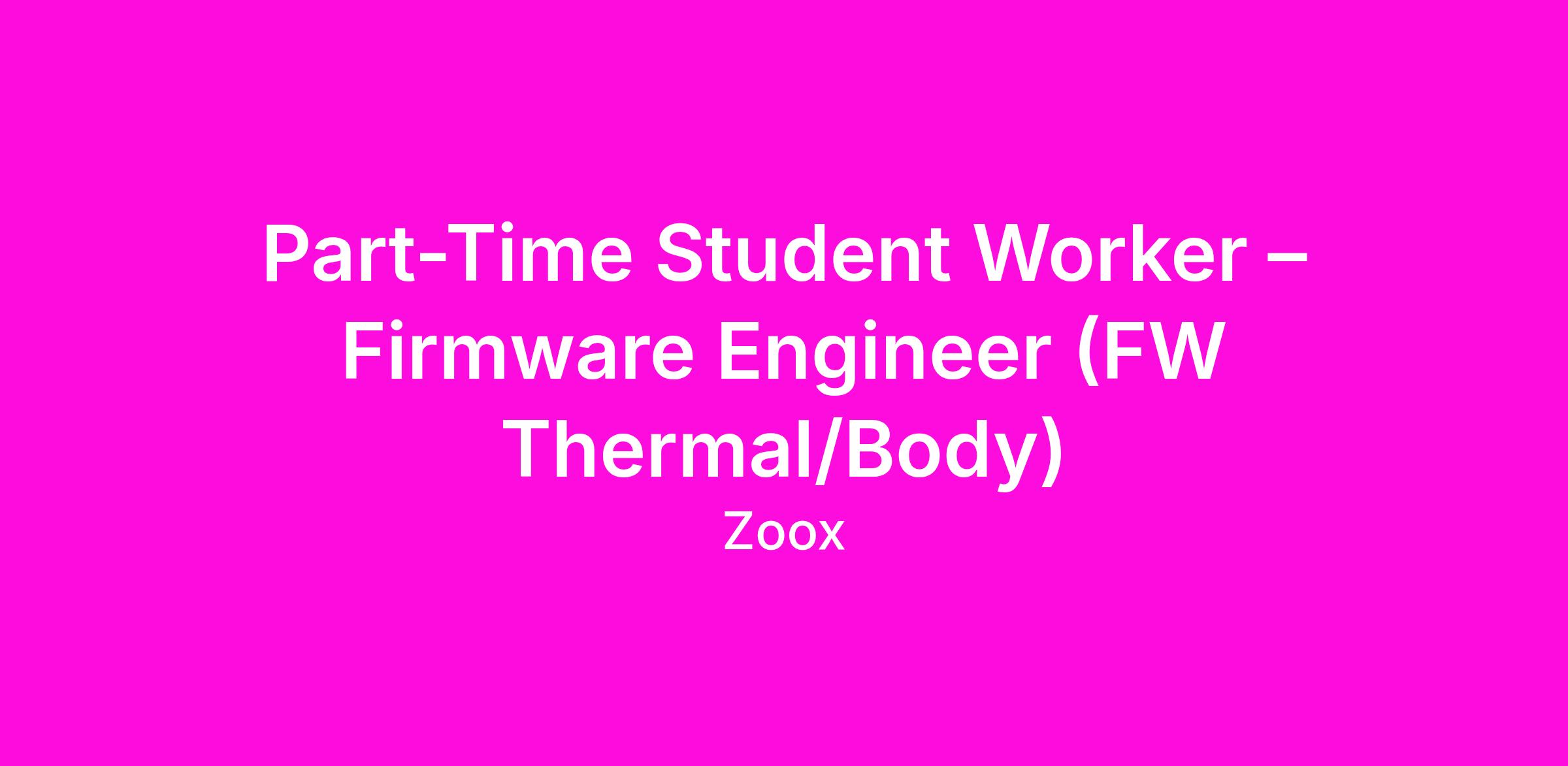 Project OverviewZoox is seeking a motivated Firmware Engineer student worker to join our team, focusing on diagnostic services for the thermal and body systems. This is an opportunity to own highly-visible, foundational projects where you will extend our existing diagnostic infrastructure. You will work on the full development cycle of robot firmware development.
