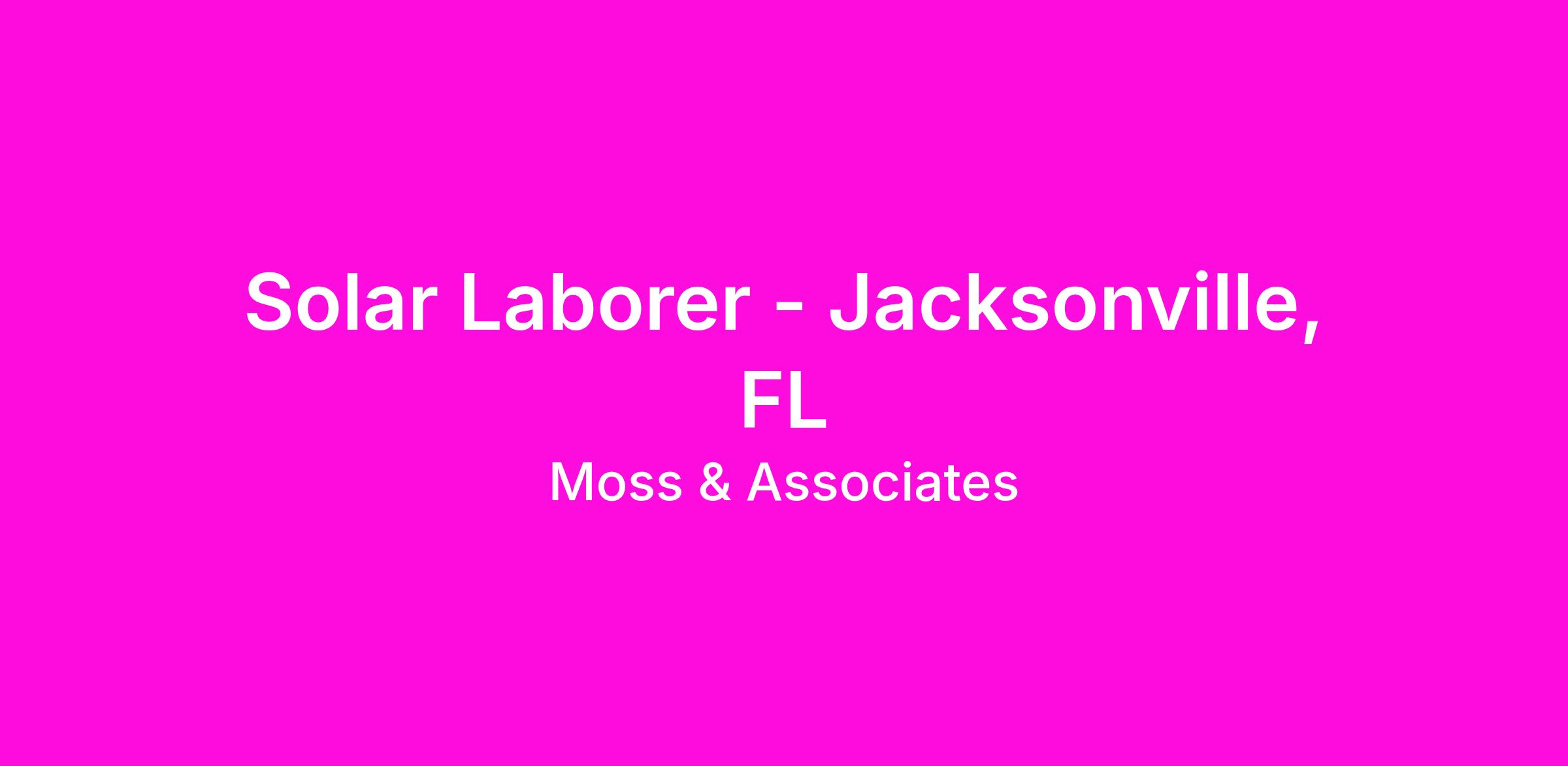 13695 OLD PLANK ROAD Jacsonville, Florida 32220No experience is necessary, so if you are hardworking, have a positive attitude, and would like to learn a trade in Solar construction, apply now!Ā MOSS was rated as the #1 Solar Contractor in the country for 2025 and is hiring team members to perform tasks involving construction of utility-scale solar projects on multiple projects. This job requires working outside in all types of weather conditions, while standing and walking for extended periods, and bending, kneeling, and lifting heavy materials.Ā Pay starts at $20 per hour and provides the ability to have growth opportunities with a long-term career and future.