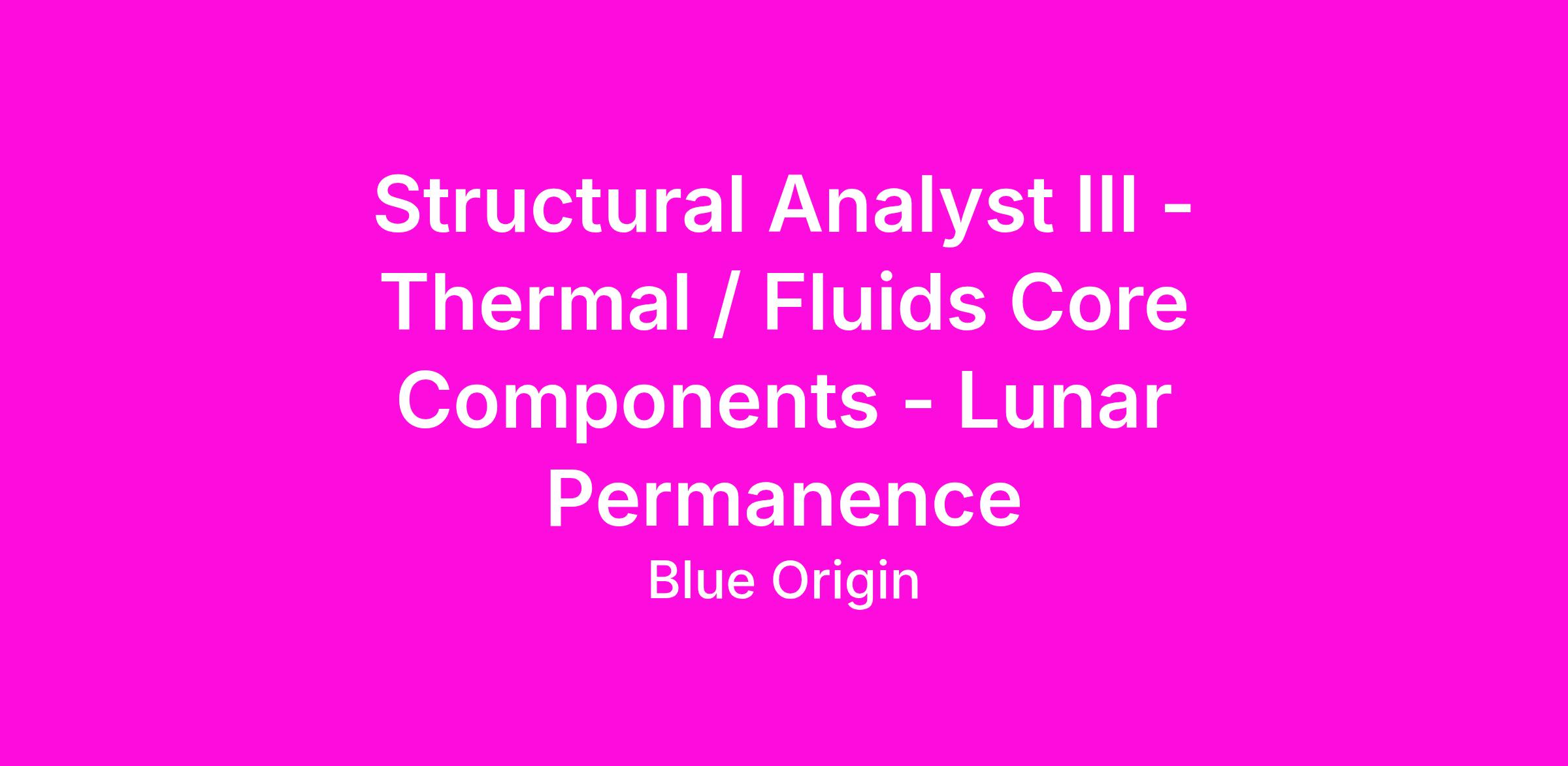 This role is part of the Lunar Permanence business unit, which develops Blue Origin’s Blue Moon landers and related products. To further Blue Origin's mission of millions of people living and working in space for the benefit of Earth, we are building sustainable infrastructure for our transport of crew and cargo from Earth to the lunar surface.We are actively seeking an experienced Structural Analyst to play a pivotal role in our Lunar Core Components – Thermal / Fluids group. Our product portfolio includes our Zero Boil-Off cryocooler, valves, pumps, radiators, heat exchangers, cold plates, and propellant management devices. As part of a small, passionate, mission driven, and accomplished team of experts, you will collaborate with cross-functional teams to design, qualify, and integrate Core Thermal / Fluids technology onto launch vehicles and/or payloads. The ideal candidate will have a minimum of 6 years of experience designing, analyzing, qualifying, and launching flight hardware. Additionally, the candidate should be technically ambitious, have grit, and a proven track record of developing processes for new technology.