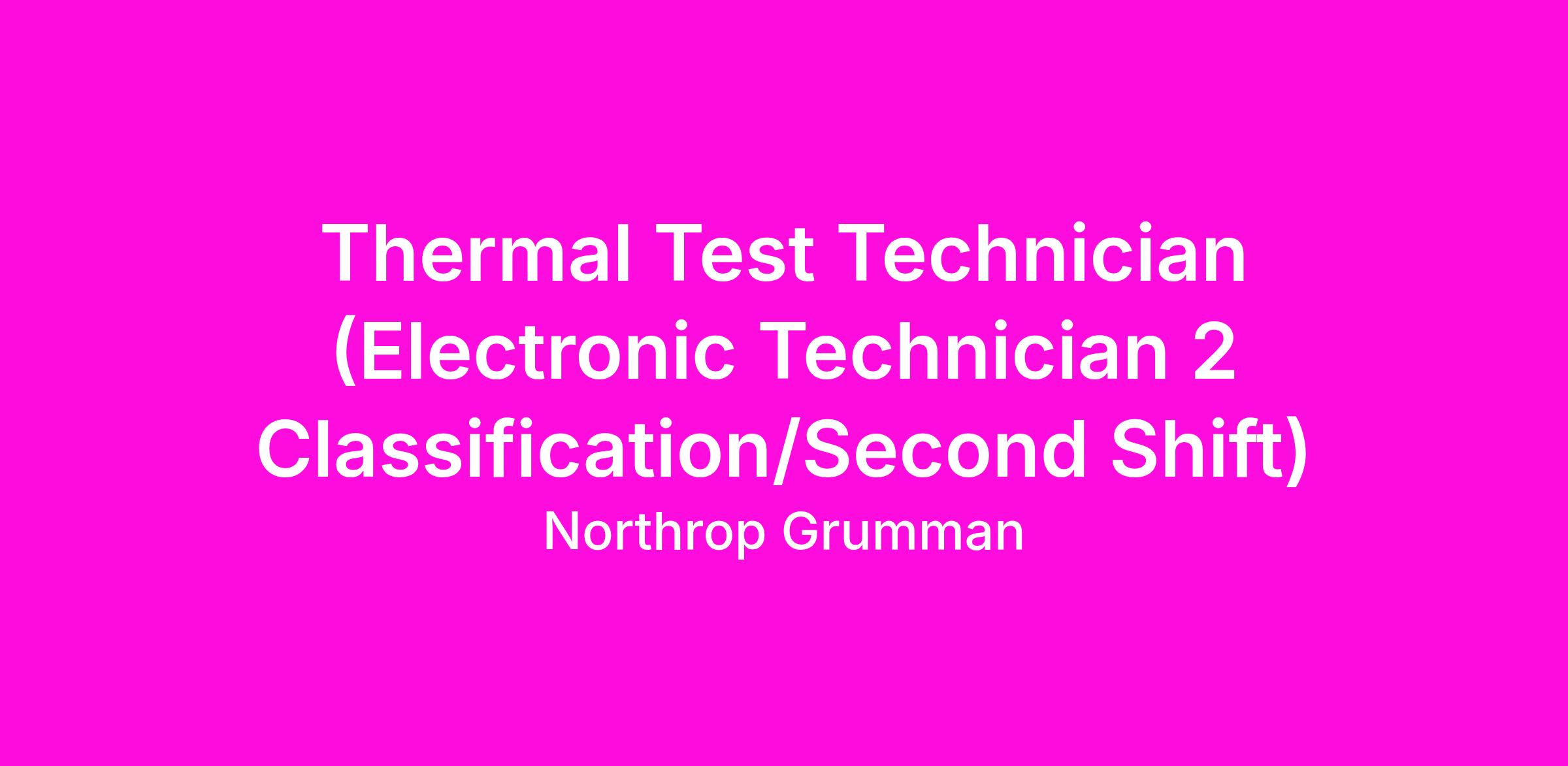 Space Systems Thermal Test Department is seeking a Thermal Test Technician (Electronic Technician 2 Classification/Second Shift) with electronics and mechanical skill set to support thermal vacuum and thermal cycle testing of complex flight and development hardware. Preferred candidate will be a self-starter able to work independently or in small teams using schematics, diagrams, written and verbal descriptions to perform environmental testing set up and operations. The ideal candidate has experience using Microsoft Office (Word, Excel, Outlook).