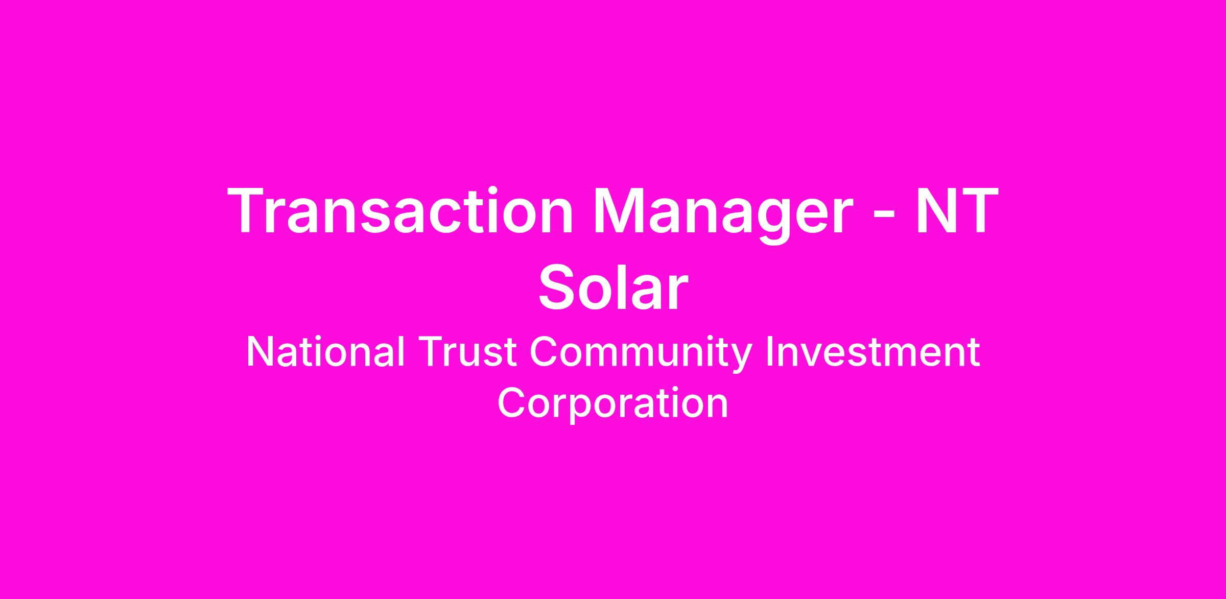 NT Solar is hiring a Transaction Manager to oversee investment due diligence, closings, and fundings for up to $300MM annually in tax equity transactions with multiple investor and developer partners. The role also includes business development and process improvement responsibilities.