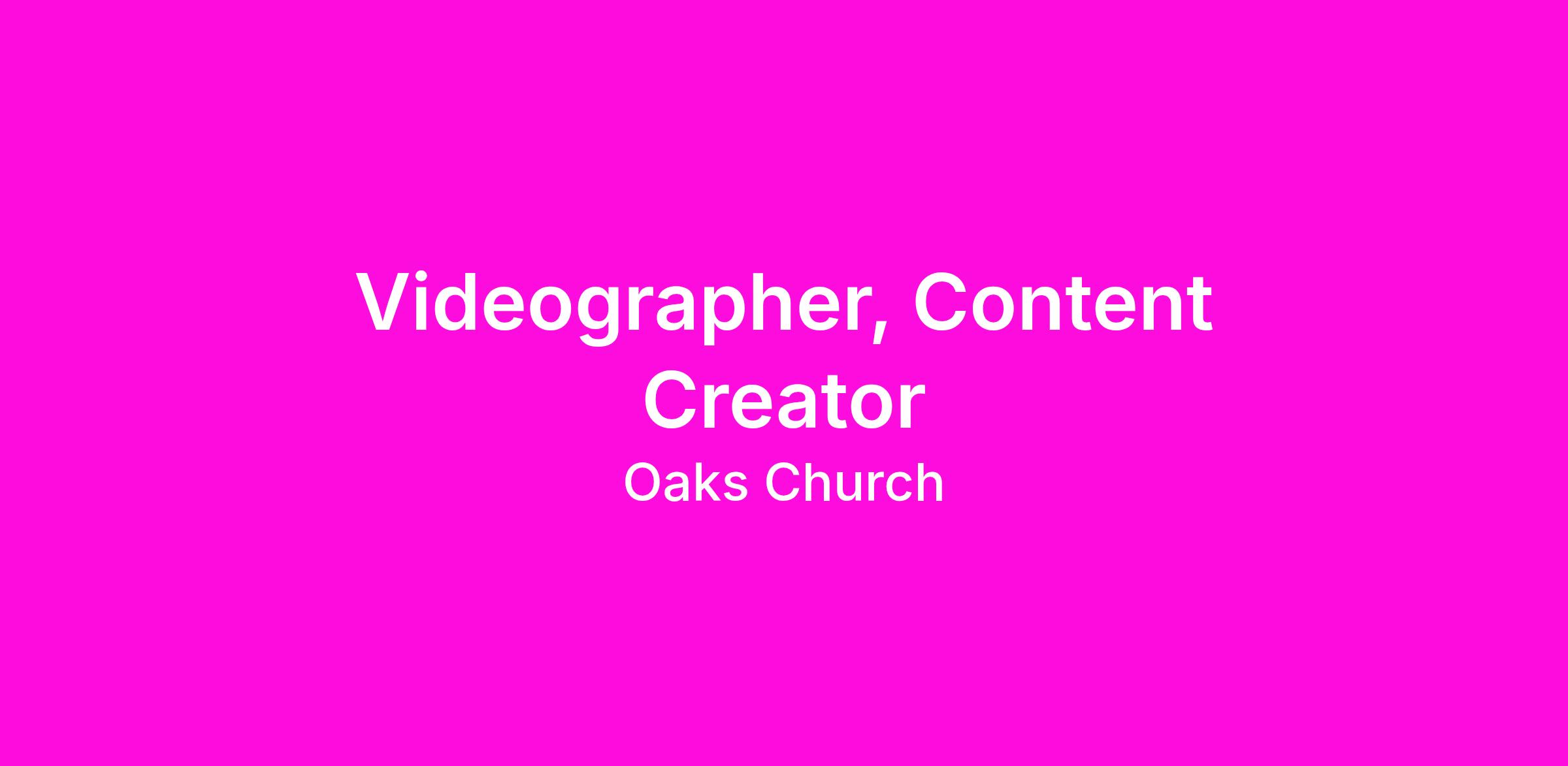 The Videographer focuses on capturing and editing uplifting and inspiring videos of Oaks Church events and ministries and its congregants as well as leading the development of a highly capable videography team. This is a full-time, hourly position, scheduled for Sunday through Thursday.